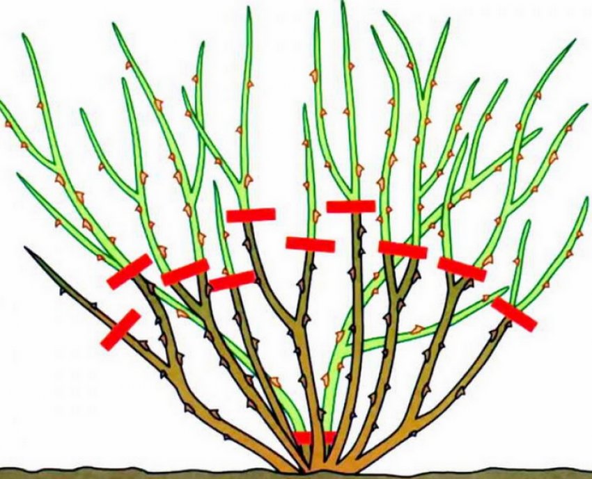 У взрослого растения должно быть не более 10-12 скелетных ветвей. На этом формировка куста будет завершена. Далее потребуется лишь санитарная обрезка. Нужно будет убирать все слабые и больные побеги и прореживать крону, чтобы свет проникал в ее центр и там могли закладываться цветковые почки.
