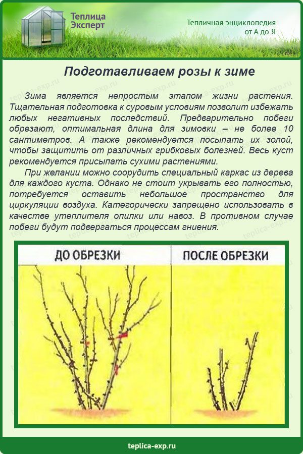 На зиму обрезают как взрослые розы, так и посаженные в этом году саженцы. При этом нужно помнить, что кусты нельзя обрезать раньше, чем начнутся ночные заморозки, поскольку любая обрезка стимулирует рост побегов.