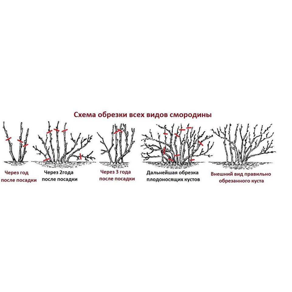 Формирование куста происходит по той же схеме, что и у черной смородины, за одним исключением: верхушки прошлогодних приростов не прищипывают, а побеги 2-ого и 3-его годов не укорачивают.