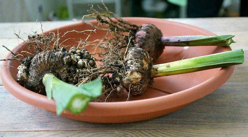 Итак, гладиолусы уже отцвели, значит, цветоносы необходимо срезать. Оставлять принято лишь небольшую часть — не более пяти сантиметров. Далее растениям необходим редкий полив и последующее выкапывание луковиц. Первыми извлекают из земли те луковицы сортов, которые распускались раньше всех. Делается это очень аккуратно — методом подкапывания и аккуратного вытаскивания. Все повреждённые фрагменты подземной части растения уничтожаются.