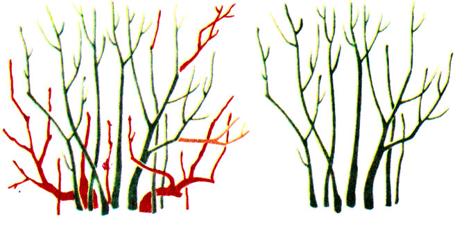 Новую поросль, появившуюся из корней, следует проредить. Осенью на нестаром кусте оставляют 2-3 крепкие ветки, остальное срезают.