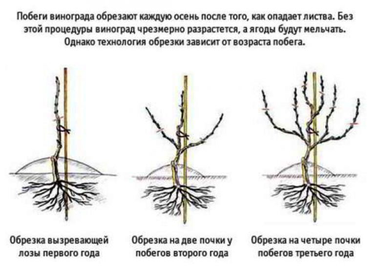 Осуществление обрезки осуществляется так, чтобы рядом с кустом была опора, к которой будет осуществляться подвязка. Чтобы сформировать участки, дающие плоды, нужно прищипывать виноград рядом с третьим узлом.