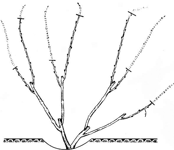 Высаженный весной саженец успевает за лето вырасти и вызреть, а в нижней части — хорошо одревеснеть. Но в середине-конце августа верхушечную точку роста надо все же выщипнуть (над 8-10-м листом), чтобы приостановить дальнейший рост лозы. Для наглядности на рисунках-схемах изображаются не листья, а только почки. Осенью перед укрытием надо сделать обрезку молодого растения, оставив всего 2 почки. На зиму требуется организовать сухое укрытие — такое же, как для роз.
