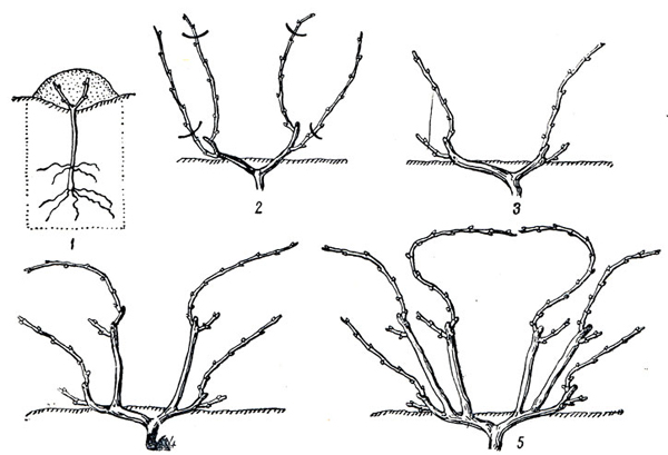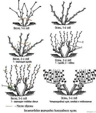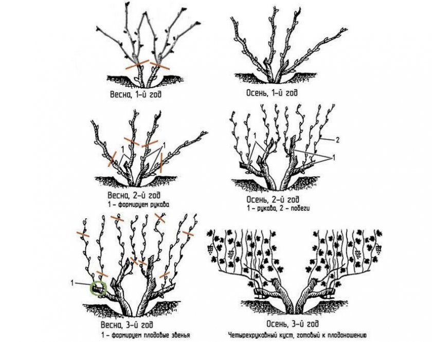 Жвакиным, по наблюдениям садоводов, очень подходит для Москвы и области. Куст, сформированный двумя рукавами, осенью легко уложить на почву, что позволяет довольно просто укрывать его на зиму. В Подмосковье для зимовки винограда, высаженного в грунт, укрытие требуется обязательно. Чтобы четко понимать, откуда что берется, рассмотрим обрезку этой культуры по годам.