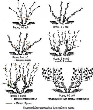 Бесштамбовый способ оставляет у основания один метр до первых побегов, а внизу располагается массивный ствол. Такой вариант хорош для теплых регионов, где укрывать лозу на холодное время года необязательно.