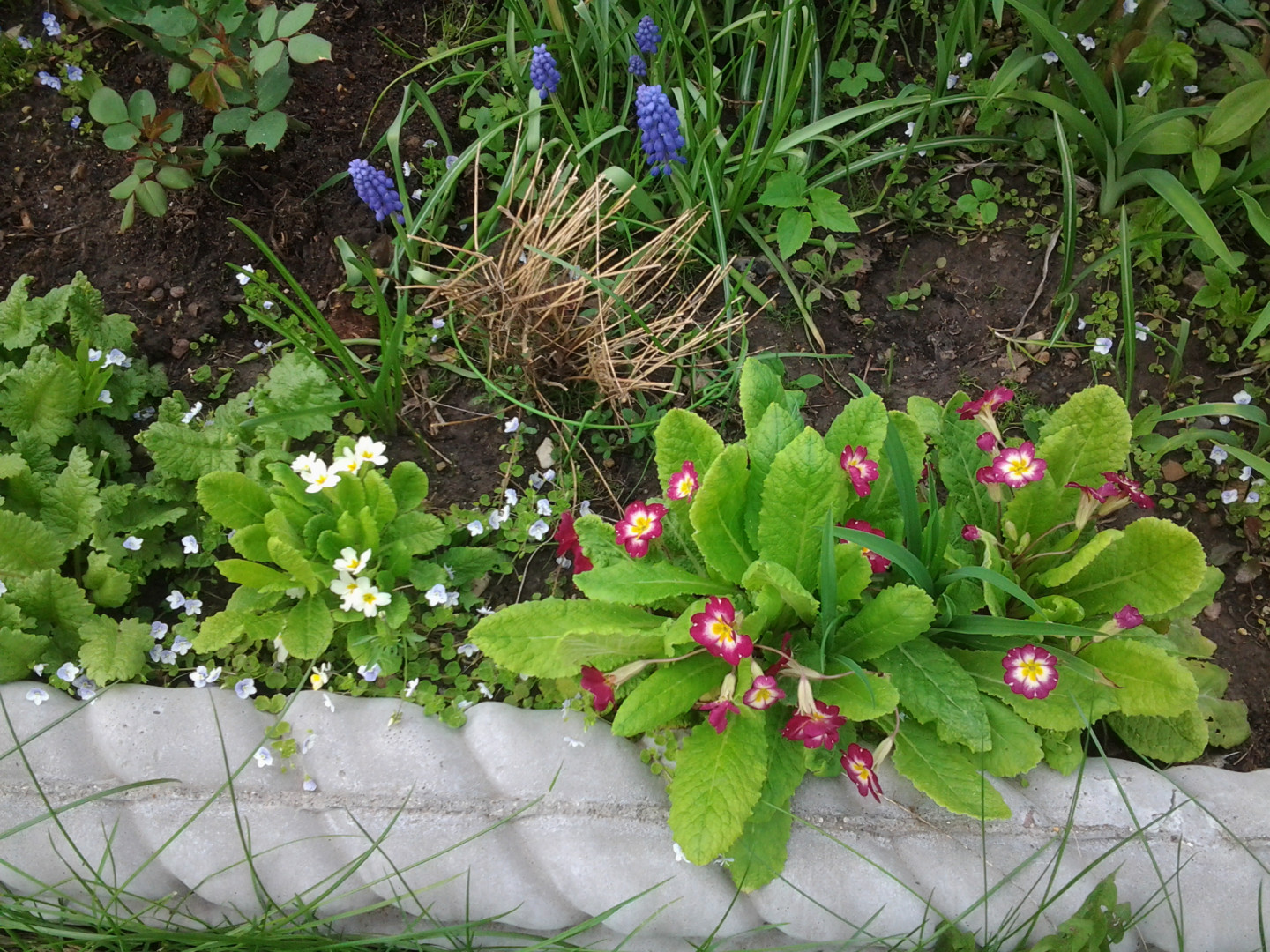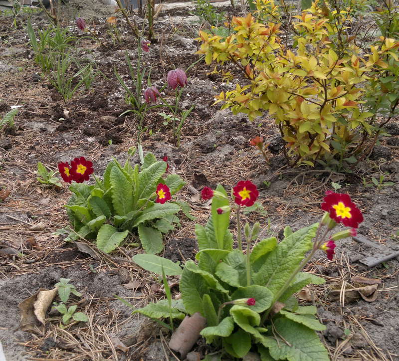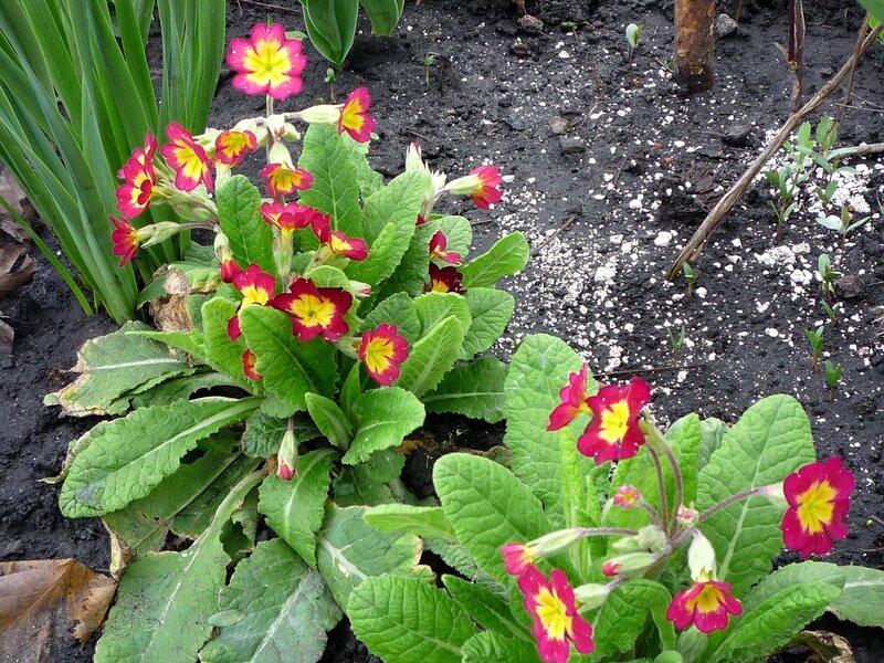 | Примула зубчатая, как сеянцы второго года жизни, цветут на грядке, которую я мульчирую измельченными листьями и хвоей. |