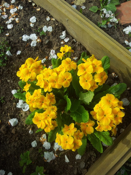 Мои примулы polyanthus посажены рядом с моими приподнятыми грядками в огороде или на них, а некоторые из них высажены на солнечной стороне наших самшитовых изгородей под шипованными яблонями.