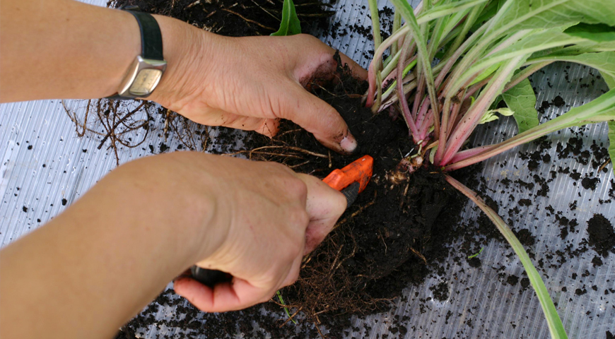 Кроме семенного способа для размножения примулы используют деление куста и листовые черенки. На четвертый или пятый год разросшиеся кустики примулы в августе или первой половине сентября поливают, выкапывают, отряхивают с их корней землю, затем промывают корни в ведре, делят растение ножом на несколько частей с хотя бы одной точкой возобновления на каждой, присыпают срезы золой и тут же высаживают деленки на новое место. После посадки примулу поливают. Деление куста не только омолаживает растение, но и дает бесплатный посадочный материал, в котором вы можете быть совершенно уверенными.