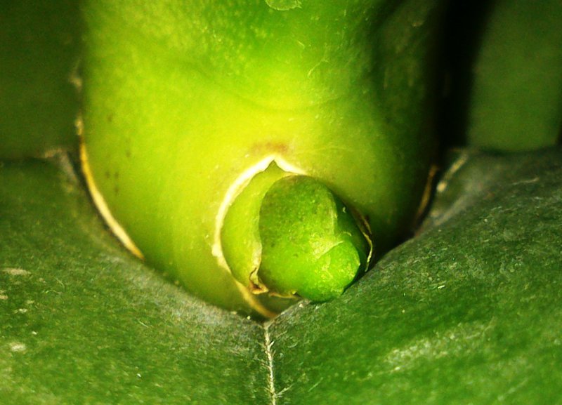Обычно он прорастает из пазухи листьев – места, в котором лист вплотную подходит к стеблю. Он прорывается сквозь лист. Цветонос обычно плоской формы, но с заостренным кончиком, имеющим ступенчатую форму. Он салатового или насыщенного зеленого цвета, растет вверх или вбок, направляясь к солнцу.