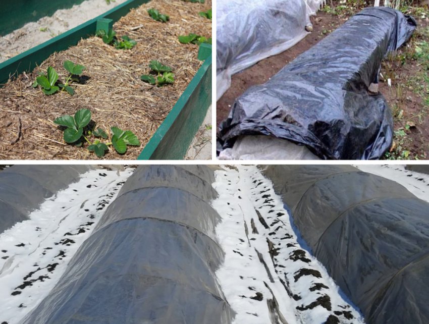 Клубнику можно закапывать под мульчу. Весной через укрытие будут проходить только здоровые растения, что сделает участок более здоровым. Однако в большинстве случаев клубнику оставляют открытой. Просто те листья, которые скапливаются вокруг них.