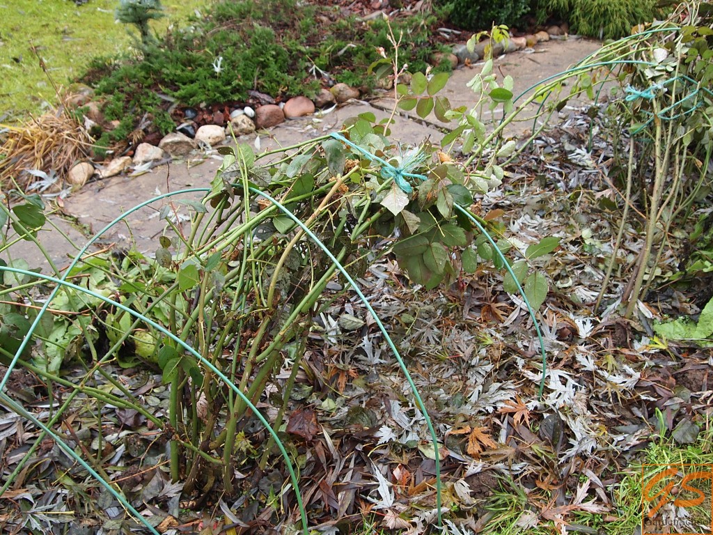 Когда куст плетистой розы пригнётся настолько, насколько это возможно, его необходимо закрепить дугами из подручных средств или приобретенными в строительном магазине. Можно использовать металлические электроды, пластиковые трубы – их преимущество в том, что они не портятся от мороза, гибкие и прочные, способны охватить огромный куст.