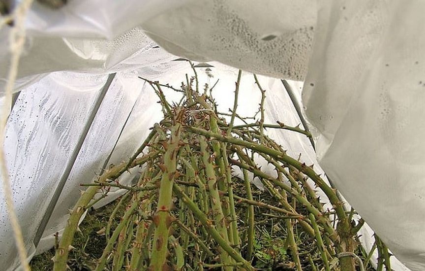 Поверх роз выстраивают импровизированный каркас, который накрывают материалом, не пропускающим влагу и удерживающим температуру. Крыша каркаса должна быть достаточно пологой, чтобы снег равномерно лёг на укрытие. Утепление создаётся за счёт воздушной прослойки внутри импровизированного «домика».