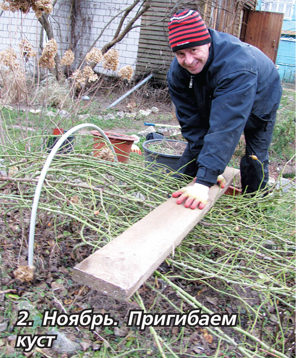 Плетистые розы необходимо на зиму пригибать. Сам процесс пригибания колючий, поэтому обязательно подготовьтесь к нему заранее, используя прорезиненные перчатки и толстую куртку.