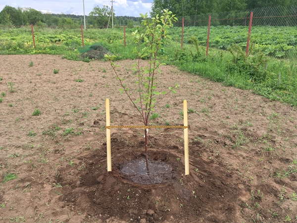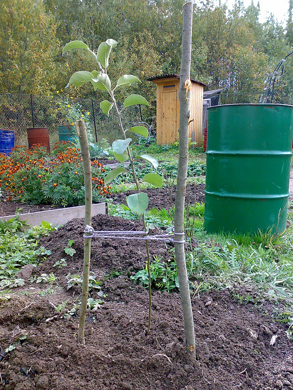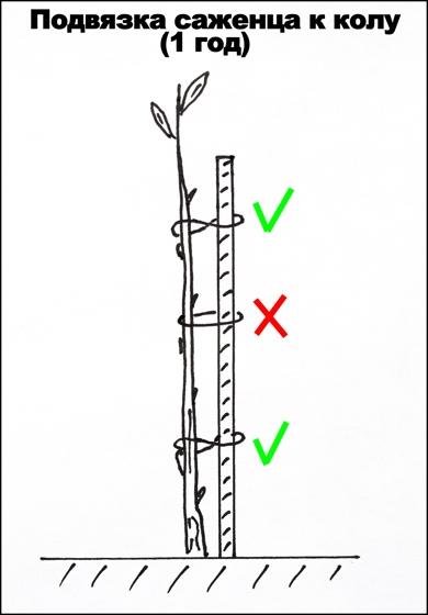 Это позволит ростку яблони расти вертикально вверх, не вредя ему самому.