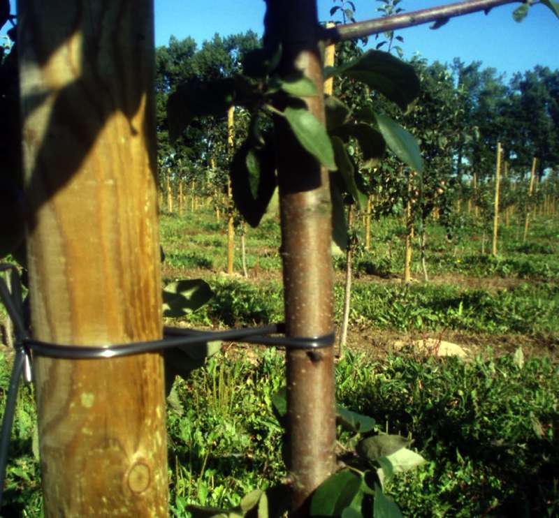 При посадке обязательно подвязывают саженцы яблонь любого сорта. Делается это с целью зафиксировать деревце в устойчивом положении, иначе первый порыв сильного ветра может вырвать яблоню или сильно расшатать ее. До 2,5 лет плодовые деревья имеют слабо развитую корневую систему, поэтому без фиксации ствола к опоре не обойтись.