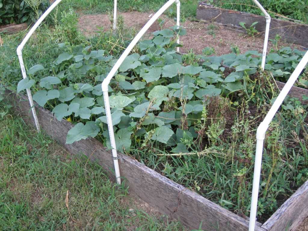 С обеих сторон от грядки установите металлические или деревянные опоры высотой 2 метра. Сверху сделайте деревянную перекладину или натяните шпагат.