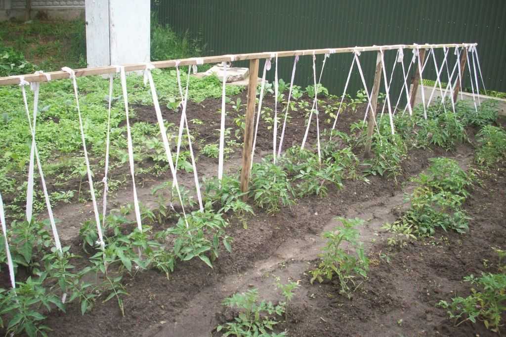 - Крепите тканевую ленту или шпагат прямо к стеблю растения или к небольшим колышкам, вбитым рядом с каждым кустиком.
