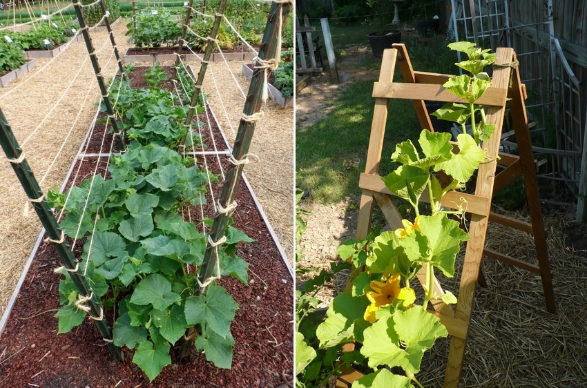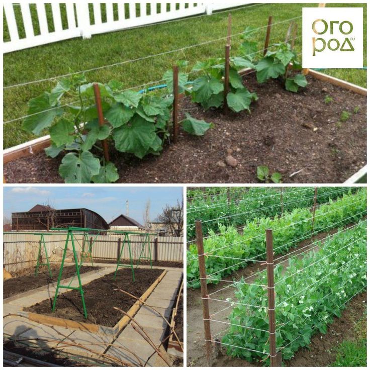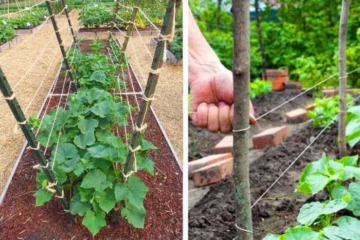 Начните с посадки огурцов у подножия и закрепите садовой бечевкой.