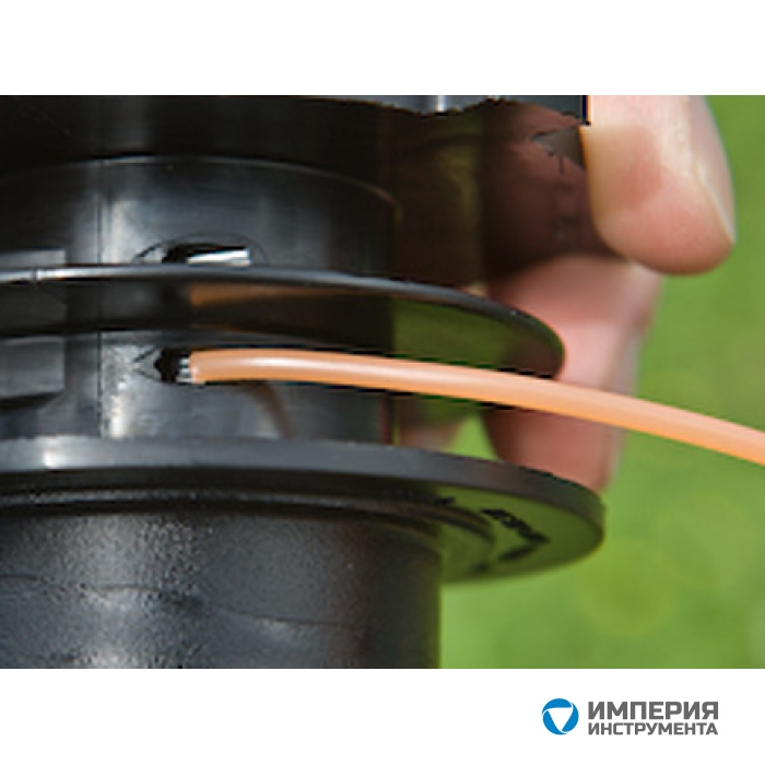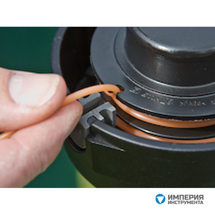 Намотайте обе части на канавки катушки по часовой стрелке так, чтобы осталось два свободных отрезка длиной 15-20 см. Эти отрезки просуньте в отверстия корпуса. Наматывать следует аккуратно, чтобы витки не пересекались. Вставьте шпульку и закройте крышку до щелчка фиксаторов. Затем зафиксируйте вал редуктора и навинтите деталь на место.При замене лески не стоит выбирать леску большей толщины чем та, которая рекомендуется для использования на конкретной головке. Слишком толстая леска может застревать в отверстиях головки и будет создавать повышенную нагрузку на инструмент (на двигатель).