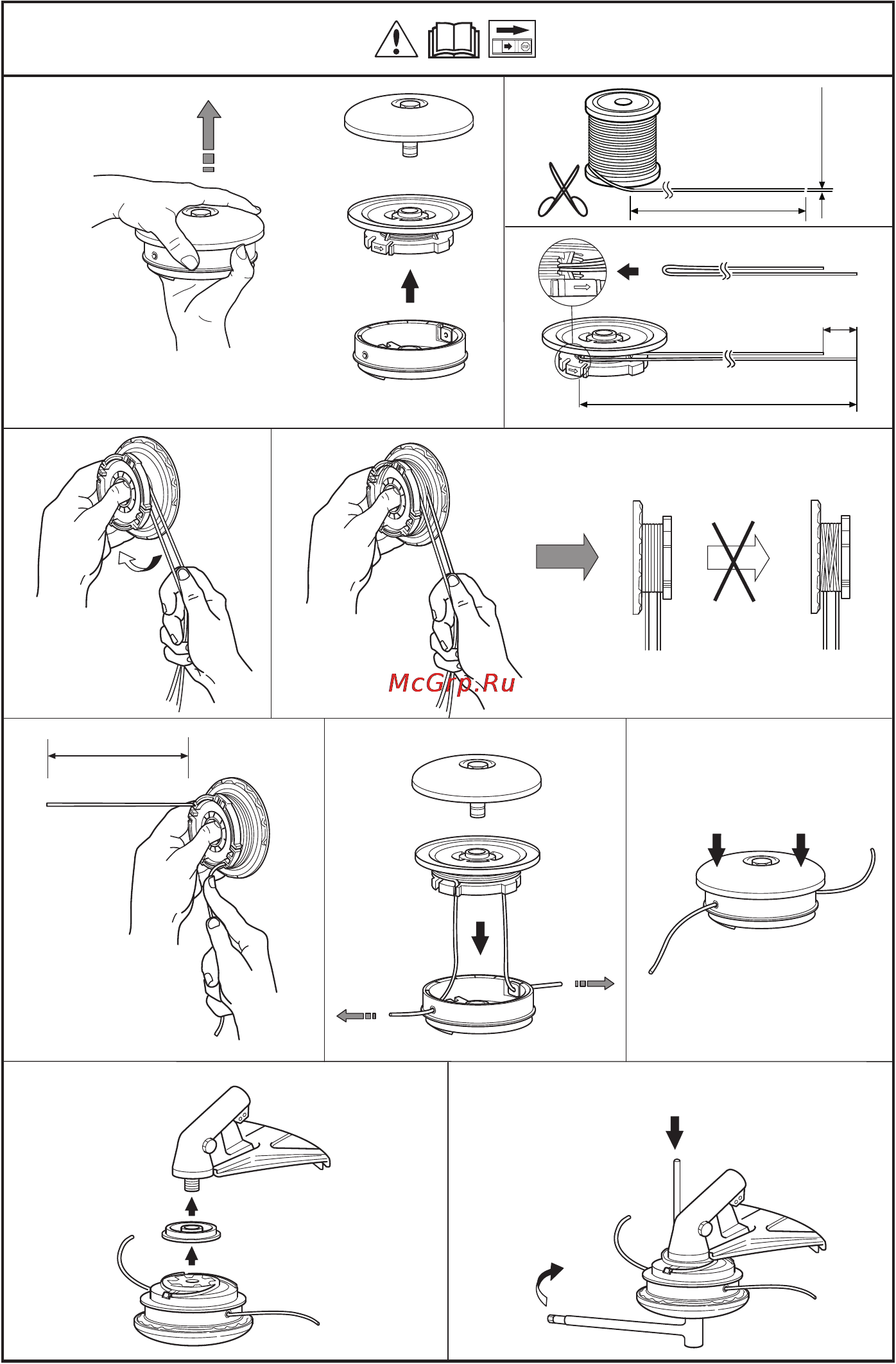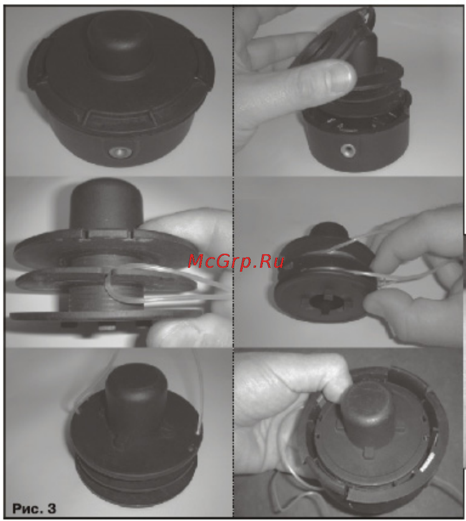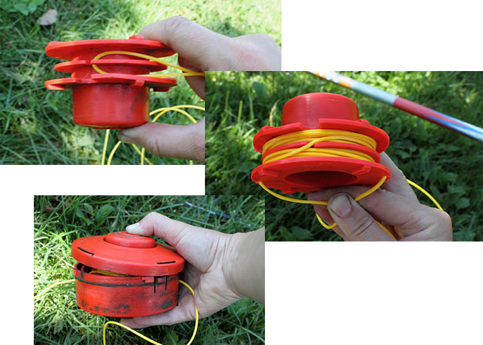 Оснащение катушки новой леской выполняется по факту в обратном порядке. Процедура выглядит примерно так, как описано ниже, независимо от модели газонокосилки: