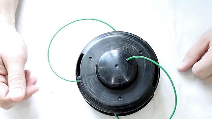 Вытянуть концы лески через пару овальных прорезей катушки. Заменить обе шайбы и пружину (если таковые есть в конструкции) входящими в комплектацию новыми элементами. Согнуть оба конца лески под прямым углом.