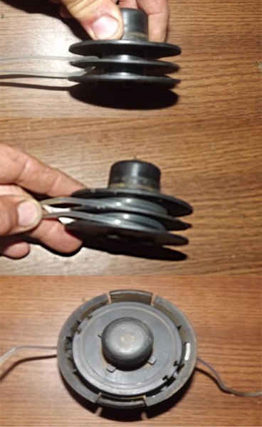 Ниже будут подробно описаны только шаги, относящиеся к головкам двойного триммера. Остальные перечисленные шаги такие же, как и для однолинейных триммерных головок, как описано в предыдущем разделе этой статьи. 1. Снимите катушку головки триммера 2. Вставьте триммерную леску и намотайте леску