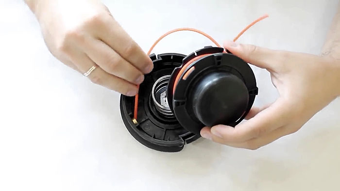 Последний технический штрих процесса замены лески на триммере – наложение крышки на головку с последующей фиксацией путём нажимного усилия и небольшого проворачивания.Пропустить каждый конец в отверстие, что в основании намоточного барабана. Установить катушку во внутренней области головки с упором на пружину. Наложить крышку, выровнять по основанию и лёгким нажимом вниз с малым вращением против часовой стрелки, посадить крышку на язычки фиксаторы. На этом процедура замены завершается.