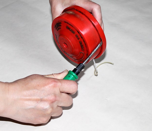 Следует высвободить леску из отверстий провернув барабан , после чего аккуратно извлечь катушку из области головки. Намоточный барабан некоторых моделей установлен на пружине. Этот момент нужно учитывать, выполняя операцию по извлечению.