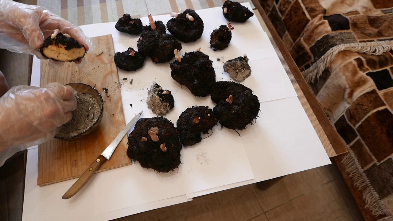 Понять где верх, а где низ поможет следующая информация: нижняя сторона клубней выпуклая, а верхняя — плоская или вогнутая. Кроме того, верхние части имеют точки роста. Это едва заметные неровности и бугорки. Если удалось приобрести крупный клубень с большим количеством точек роста, его можно разрезать ножом на несколько частей. Но при этом надо следить, чтобы на каждой из них было минимум 3 точки роста.