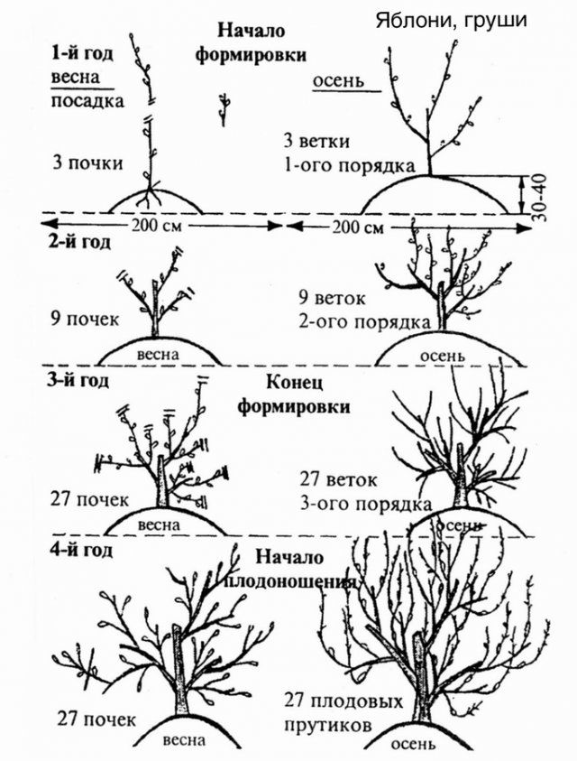 Во время второго сезона покоя срежьте верхушку молодой груши на высоте 24–30 дюймов над самой верхней веткой лесов. Это вызовет рост новых побегов и ростков вверх. В течение третьего сезона покоя мы выберем самый сильный вертикальный стебель, который будет центральным лидером (стволом), и удалим все боковые ветви с ветвей каркаса, за исключением самых сильных двух или трех.