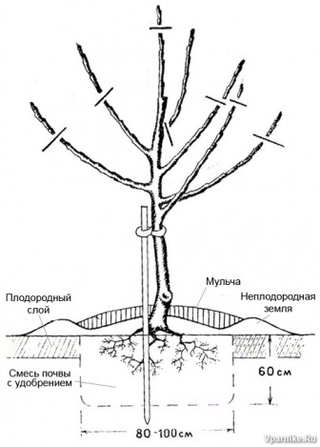 Размер посадочной ямы зависит от размера корневой системы деревца. Ее ширина составляет примерно метр, а глубина – полметра. Если почва на этом участке бедная, то яму роют поглубже для того, чтобы на дно насыпать плодородной земли. Можно использовать ту же почву, только смешать ее с перегноем или золой. Хорошо бы подкормить эту почву удобрением.
