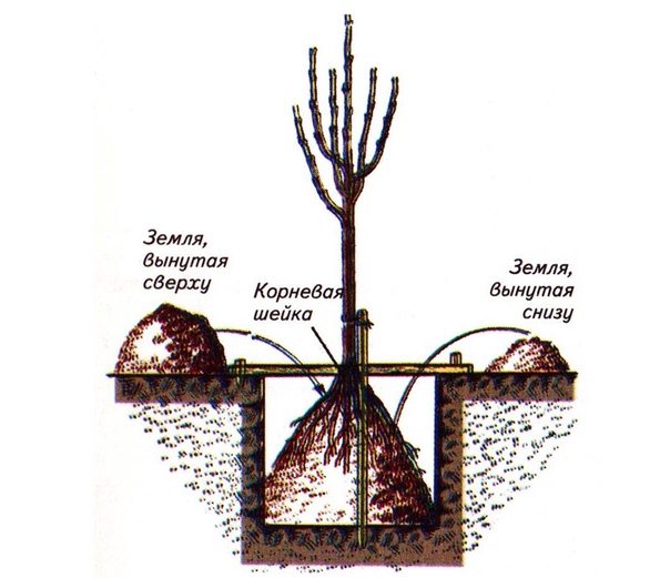 В яму обязательно необходимо добавить перегной, дерн, верховую землю, удобрения, сделать холмик, куда будет вбиваться деревянный колышек. На холмик ставят саженец, корни расправляют красивым веером, при засыпании землей нужно, чтобы корневая шейка находилась приблизительно на 6 см выше поверхности грунта.