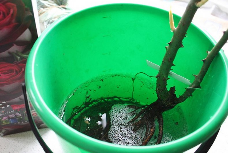 - Контейнер с почвой проливают водой, и размещают саженец розы, расправив его корни.