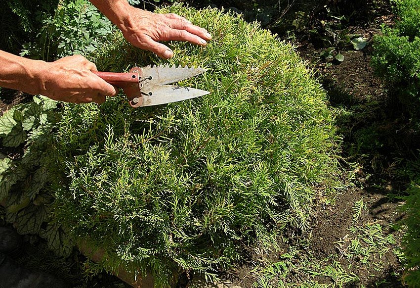 Обрезать растения нужно острым секатором во избежание зажевывания побегов и появления вмятин. Некоторым туям достаточно одной стрижки в год, а другие требуют постоянной корректировки кроны. При частом обрезании имейте в виду: растение ослабнет, если вы будете срезать больше ⅓ побега.