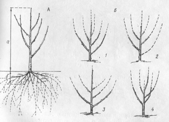 Саженцы высокорослой яблони рекомендуется укорачивать сразу после весенней посадки. Обрезка центрального ствола стимулирует закладку нижнего яруса скелетных ветвей, одна из которых займёт место центрального проводника.