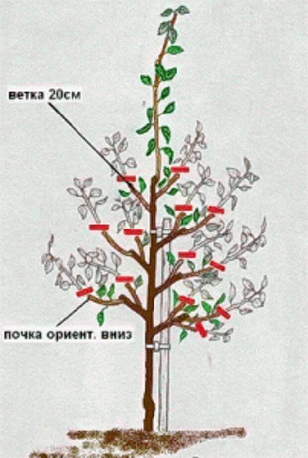 Верхушку дерева ведут в один ствол, если она раздваивается, оставляют самый крепкий побег, слабый вырезают на кольцо, либо обрезают его на 2-3 почки, чтобы в дальнейшем на этой части тоже формировался урожай.