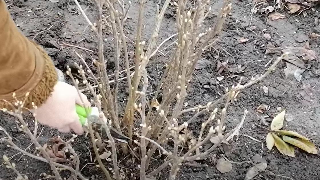 На фото: Обрезка незимостойкого кустарника на пень