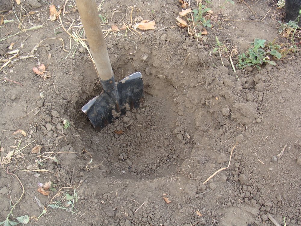 Перекопайте участок на глубину штыка и, если почва кислая, внесите под перекопку раскислитель – доломитовую муку или золу из расчета 600-800 г на м². Затем выкопайте яму глубиной не менее 60 см и диаметром около 70 см, отбрасывая верхний, плодородный слой почвы в одну сторону, а нижний, неплодородный – в другую. В дно ямы по центру вбейте посадочный кол такой длины, чтобы он возвышался над поверхностью участка как минимум на полметра. На дно ямы насыпьте холмик плодородной почвы, смешанной в равных частях с перегноем или торфом.