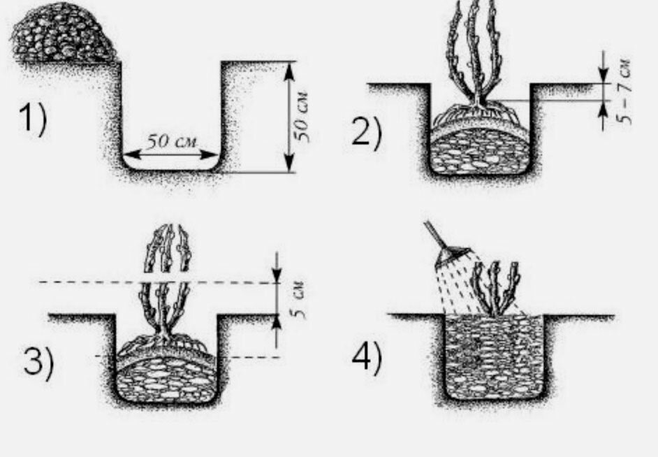 Для посадки осенью заранее готовят ямы, минимальный размер – 40х40х40, при этом отделяют верхний плодородный слой, а нижний, более скудный укладывают рядом. К плодородной части грунта добавляют ведро перегноя, 50 г двойного суперфосфата, 40 г сернокислого калия или 200 г древесной золы, часть этой смеси насыпают горкой на дно ямы.