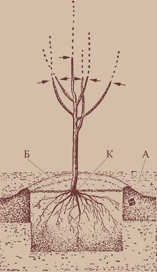 -  При посадке  деревьев с открытыми корнями  помните, что примерно четверть корневой системы была удалена при выкапывании дерева. Чтобы компенсировать это, удалите примерно четверть верхней части растения, чтобы восстановить соотношение побегов и корней 1:1. Деревья, которые приходят  скрученные и покрытые мешковиной  не нуждаются в такой обрезке; удаляйте только сломанные или низко висящие ветки.