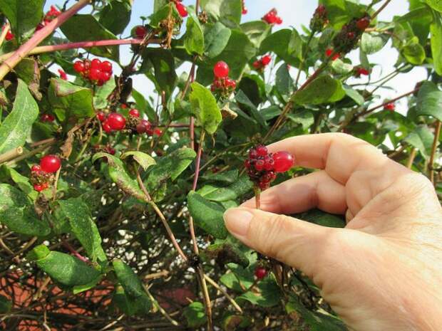 Обладая продолжительным периодом цветения, осенью дает красные ягоды.