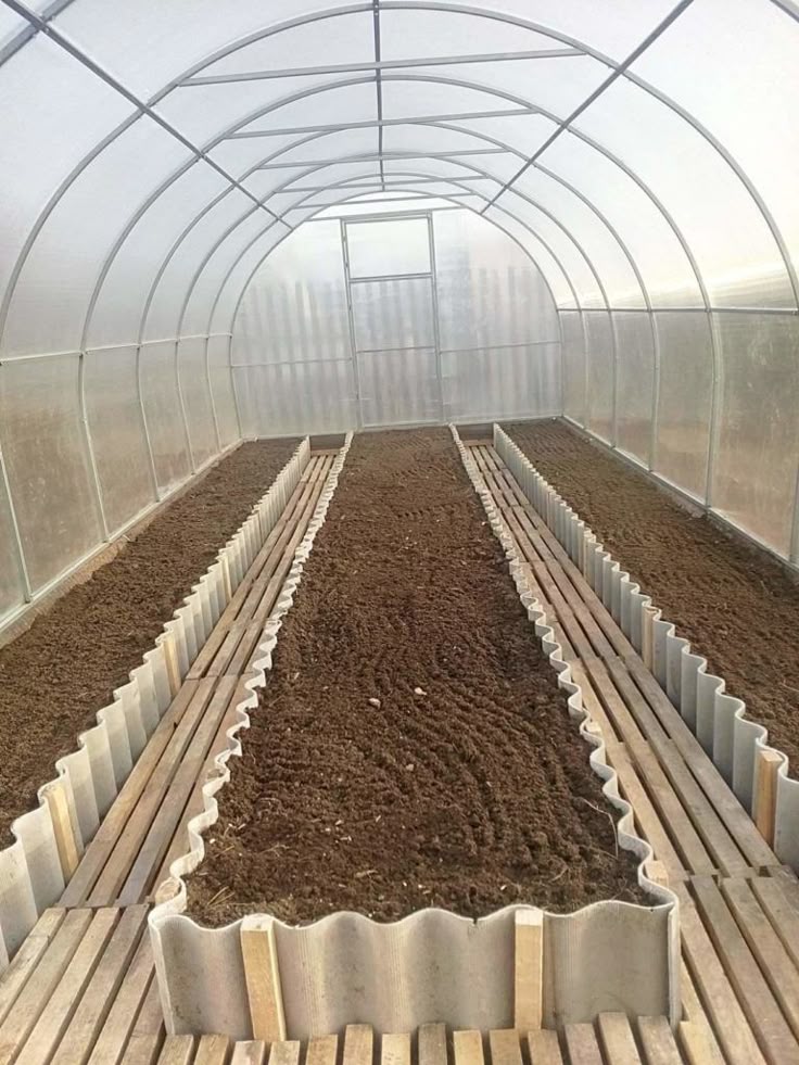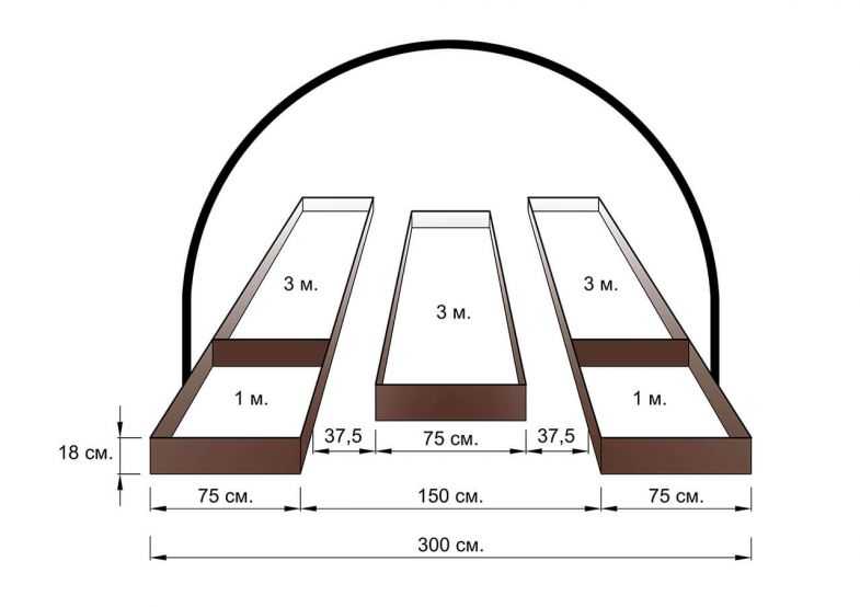 Расположение грядок определяется методом возведения теплицы, учитываются габариты.