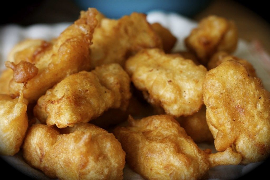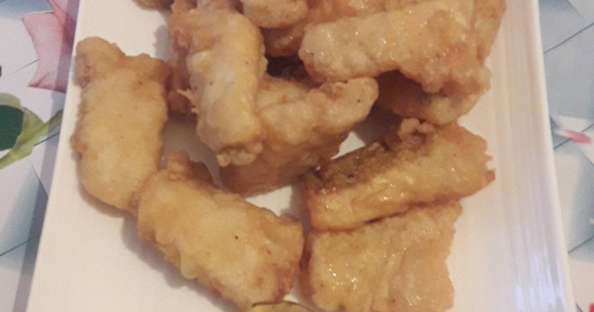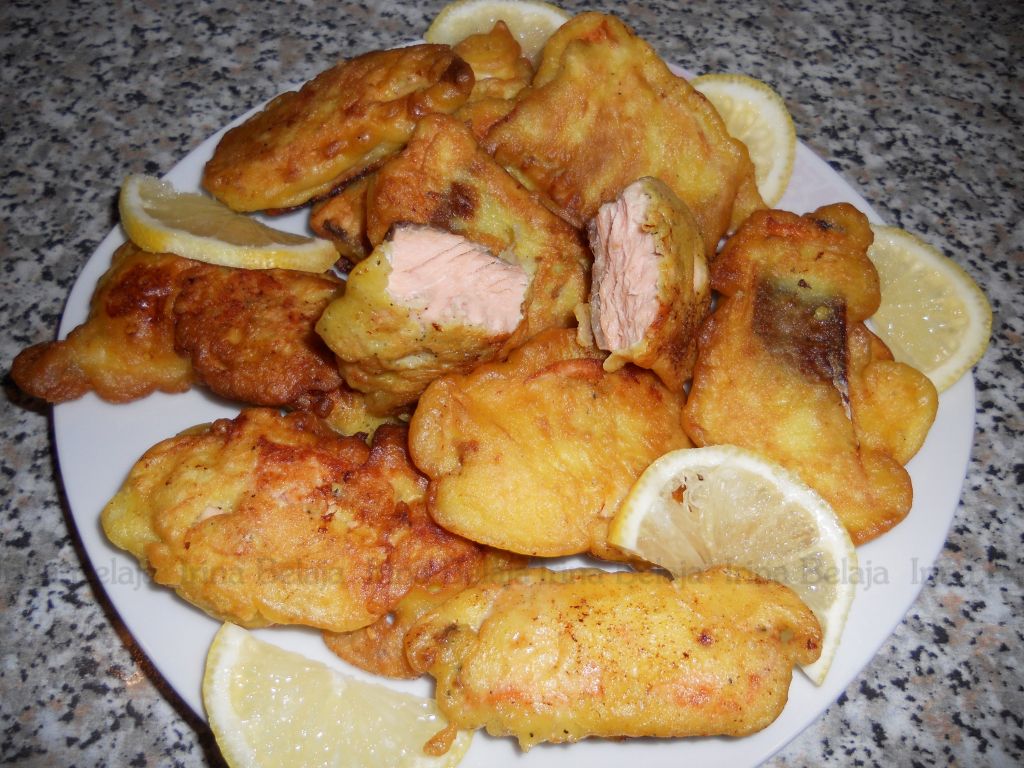 - Заранее нарезанную рыбу обжарить в приготовленном кляре.
