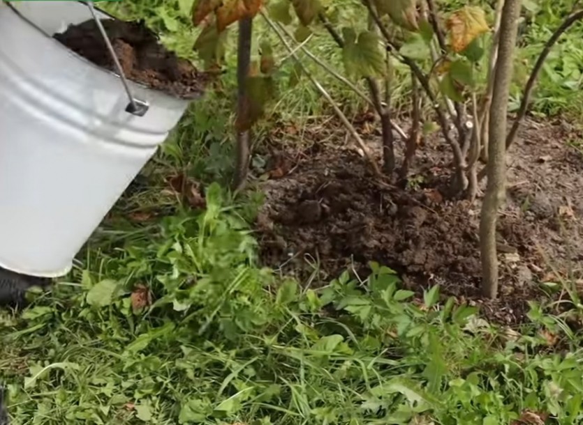 Далее переходим на почву под кустом. В середине октября можно начинать закапывать драгоценности для куста – коровий навоз и куриный помет. Без них нельзя говорить о полноценном развитии растения, так как именно навоз содержит комплекс необходимых минералов и веществ, требуемых для правильного и стремительного развития растения весной.