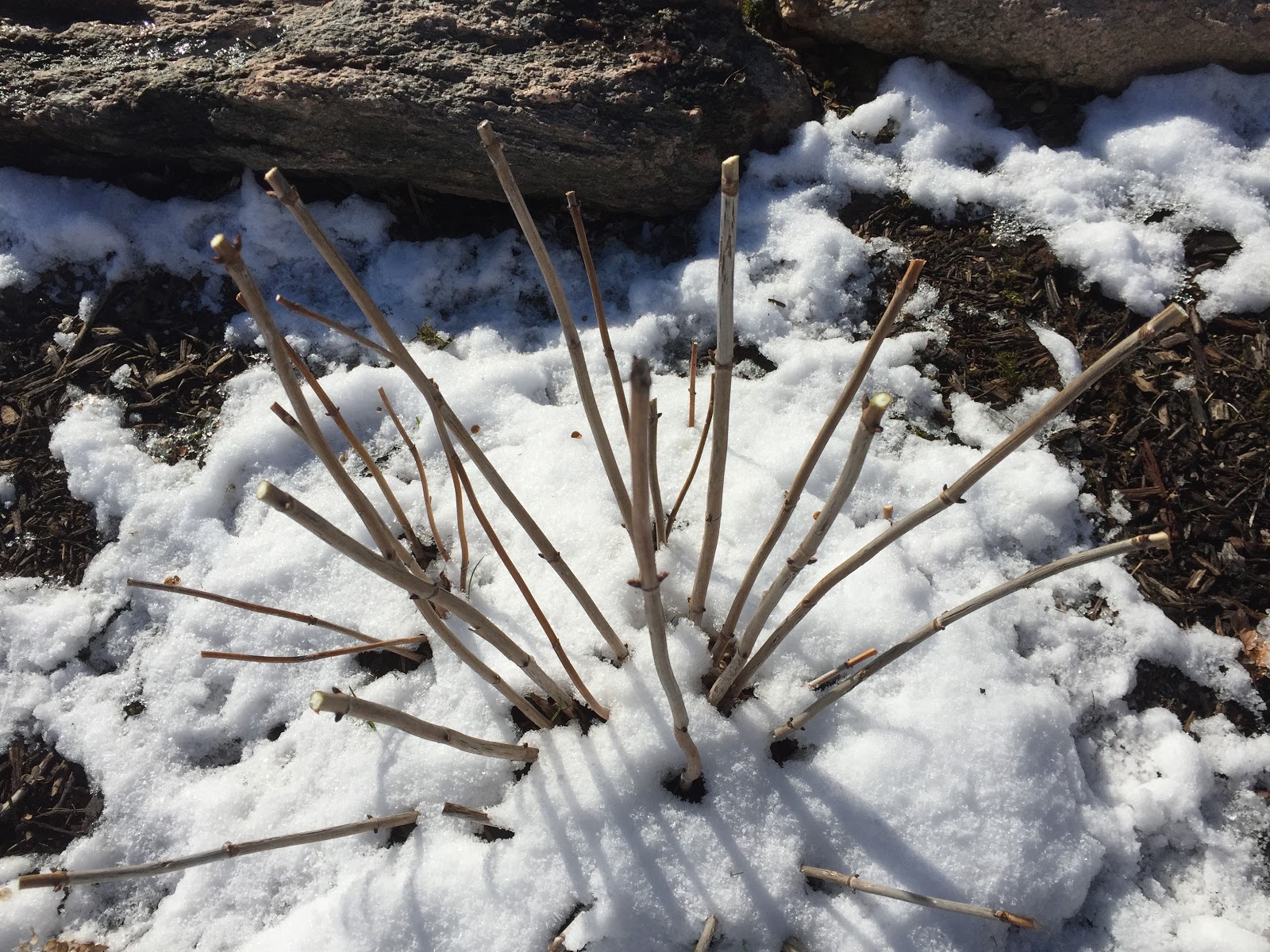 Весной гортензии необходимо тщательно осматривать: если растение сильно пострадало от морозов, на нем появляются тёмно-коричневые, практически чёрные побеги;