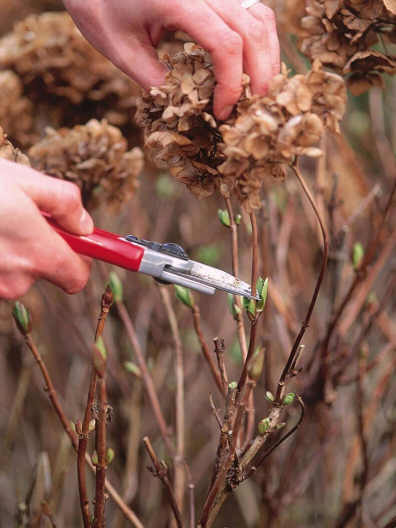 Эти гортензии цветут на старой древесине, образовавшейся в течение предыдущего вегетационного периода. Цветочные бутоны образуются в период с августа по октябрь, так что любую необходимую обрезку делайте в середине лета, до августа. Если у растения есть мертвая древесина, ее можно обрезать в любое время. После того, как крупнолистной гортензии исполнится пять лет, около трети стеблей можно подрезать до земли каждое лето, чтобы оживить растение.