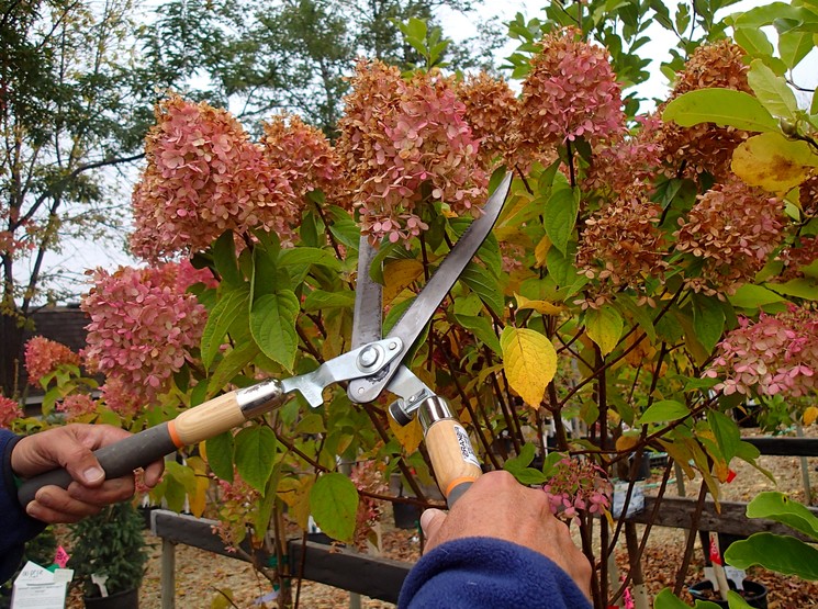 А вот метельчатая и древовидная гортензия цветёт на молодых побегах. Осенняя обрезка этих разновидностей предотвратит весеннее истекание соком при этой процедуре.