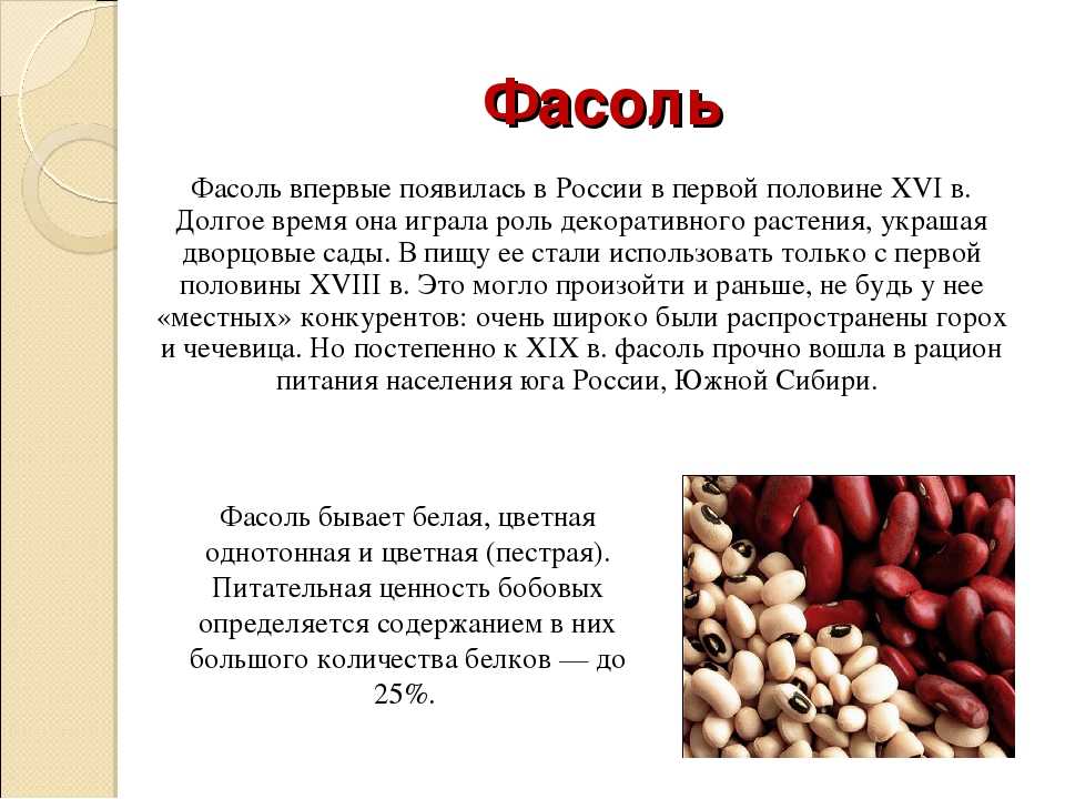 Прежде всего, фасоль почитают за высокое содержание белков (близких по составу животным белкам, поэтому бобы растения популярны у вегетарианцев) и способность к длительному хранению в сушеном виде и в виде консервов. При этом различают пищевую и зерновую фасоль: пищевая фасоль формирует сахарные бобы, которые можно есть незрелыми (зелеными), а зерновая фасоль заготавливается в зрелом виде и способна храниться очень долго.