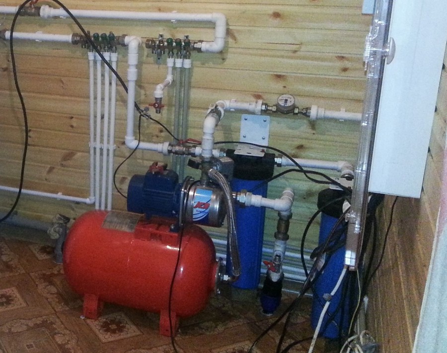 Водопровод на даче из бака удобен тем, что в него можно собирать и дождевую воду, но нужна при этом хорошая система фильтров: сначала грубой очистки, потом несколько штук тонкой. И обязательно на входе всасывающего трубопровода от насосной станции тоже ставить фильтр и обратный клапан. Фильтр — для страховки — оборудование требовательно к качеству воды, а клапан, чтобы при отключении насоса вода не сбрасывалась обратно.