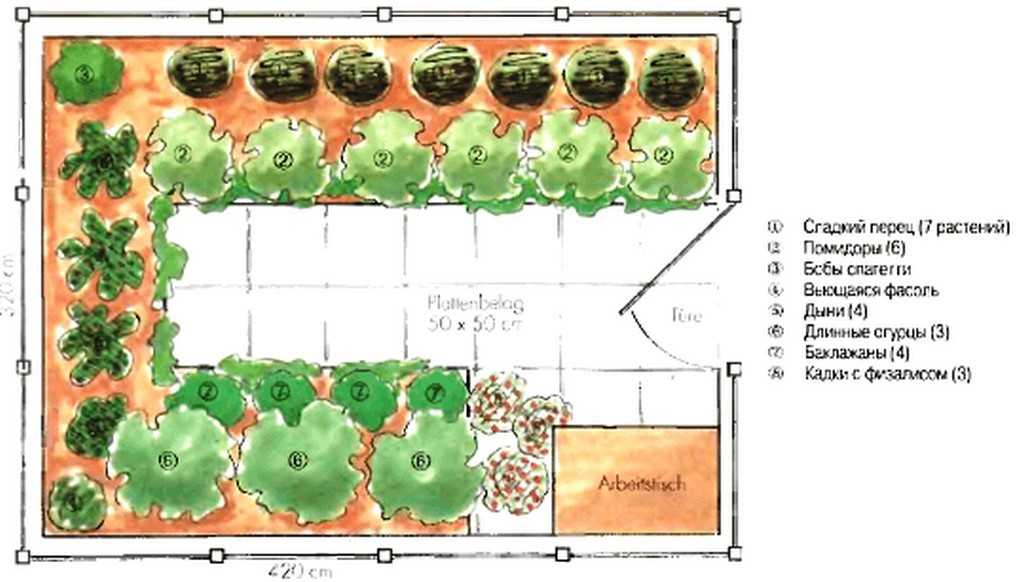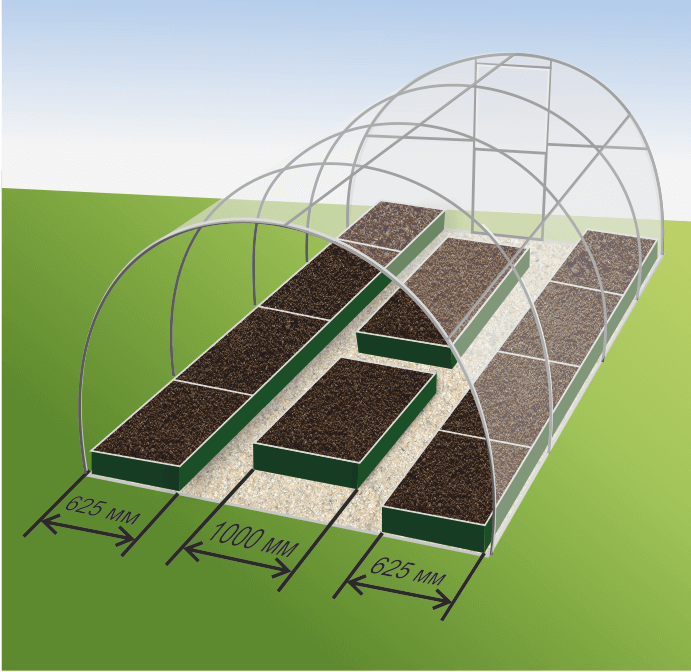 Важный момент — ширина дорожек. Их делают такими, чтобы удобно было ходить, поливать и ухаживать за культурами. Минимальная ширина 350-400 мм. Выбор зависит еще и от сорта. Так, моркови, зелени или свекле будет достаточно минимальной ширины. Для фасоли, перцев, томатов или баклажанов их лучше сделать шире.
